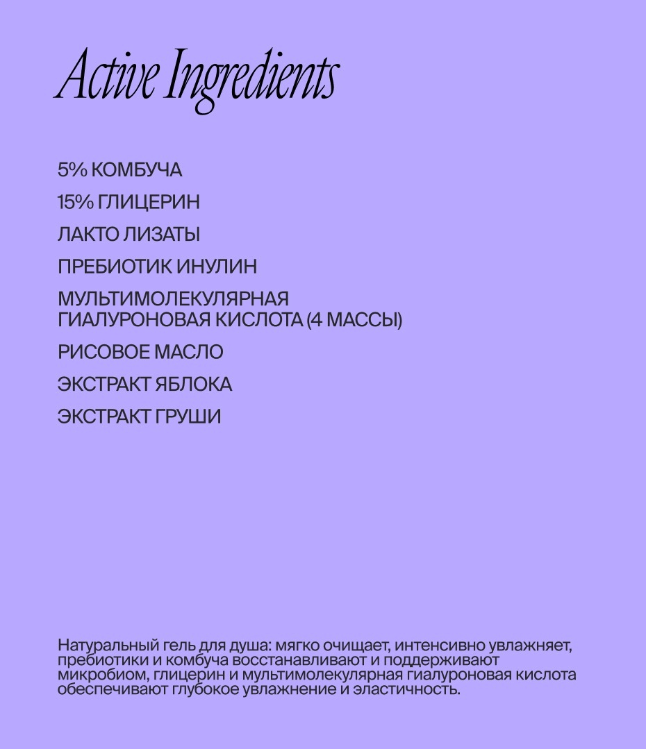 Формула нового поколения с 15 % глицерина и необычной консистенцией. Ноу-хау формулы — в том, что она очищает, не нарушая. Не сушит, не забирает влагу, не разрушает микробиом. А наоборот — поддерживает его и помогает коже сохранять баланс даже после душа.