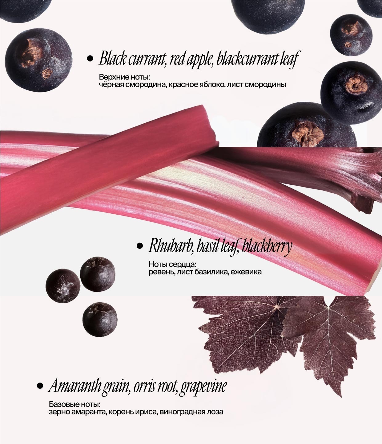 Аромат: чёрная смородина, яблоко и ревень — свежий и бодрящий, с лёгкой кислинкой, как утренний сад после дождя.
