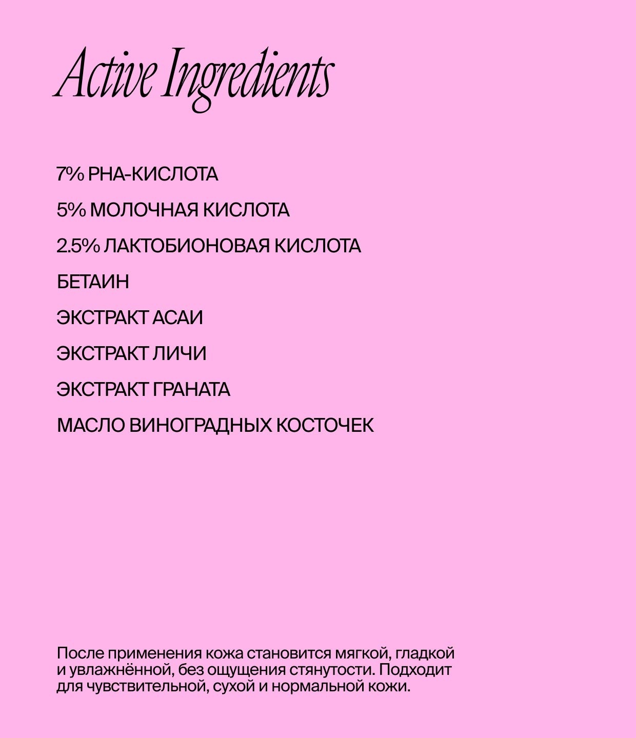 Формула с 5% AHA и 9,5% PHA-кислотами мягко обновляет кожу, поддерживает её барьер и сохраняет ощущение комфорта после применения.