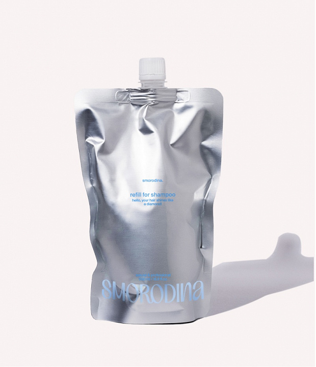 Примечание: Баночка с дозатором для шампуня не входит в комплект. Для использования рефила рекомендуем сначала приобрести любой жидкий шампунь в алюминиевой упаковке от SMORODINA.