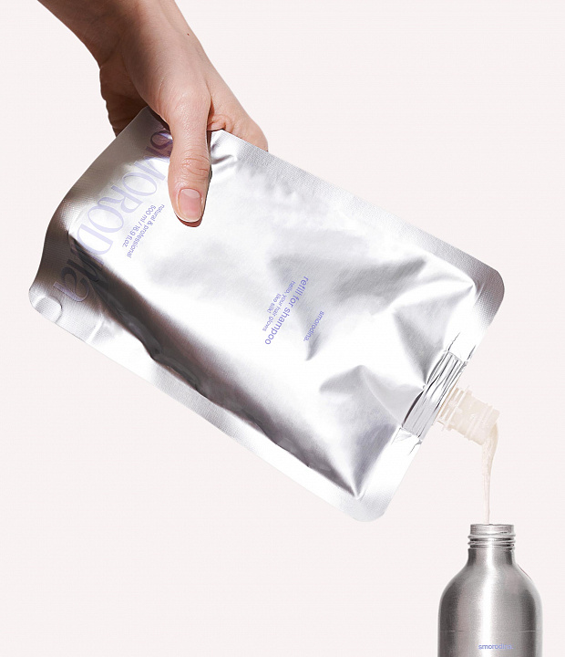 Примечание: Баночка с дозатором для шампуня не входит в комплект. Для использования рефила рекомендуем сначала приобрести любой жидкий шампунь в алюминиевой упаковке от SMORODINA.